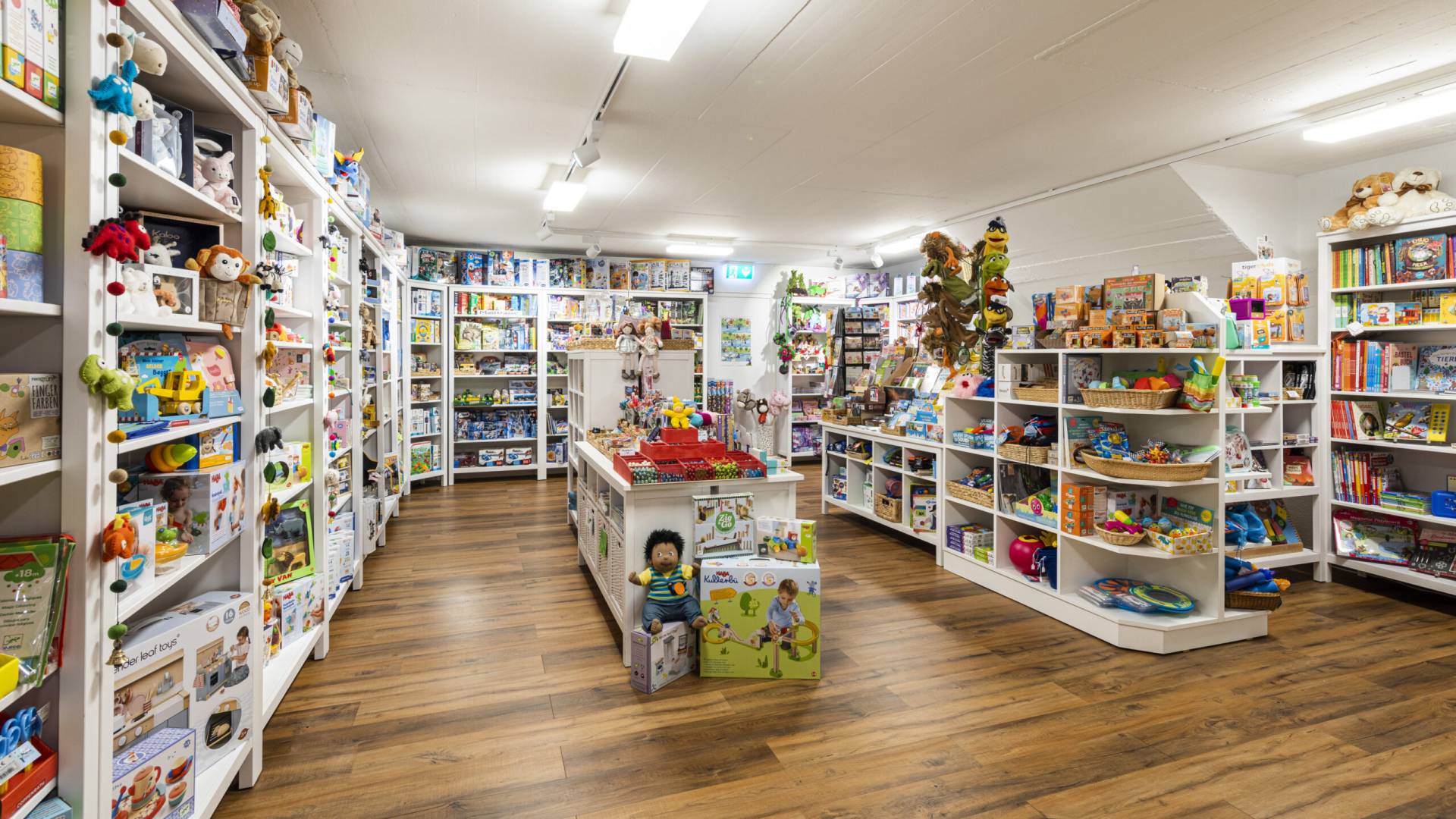 Über eine Rutschbahn (oder die Treppe) geht es in die Spielwarenabteilung im unteren Teil des Ladens. Vom Babygeschenk bis zum Experimentierkasten ist alles da.